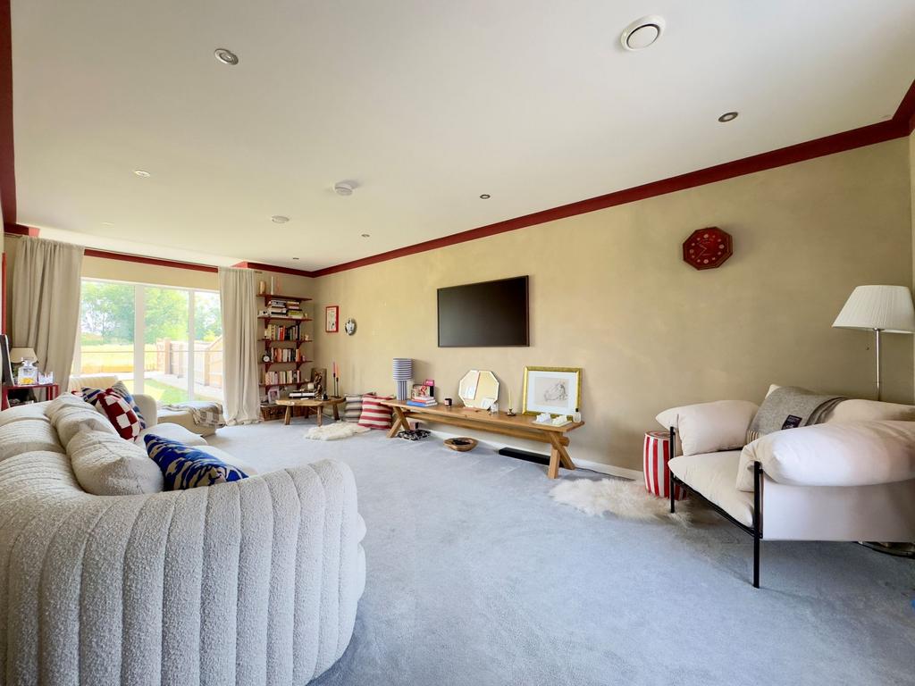 The ground floor features a generously sized entrance hall with a cloakroom, leading to a substantial living room that spans the full length of the property. A standout feature is the panoramic glass bay window, flooding the space with natural light and benefitting from uninterrupted views. The stunning kitchen/dining room also running the full depth of the home includes French doors that open directly onto the well-tended rear garden, ideal for entertaining. A separate utility room adds convenience and completes the downstairs layout.