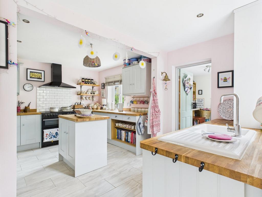 uPVC double glazed window to side and rear, wall mounted single panel radiator, wall and base units with centre island, 1 1/2 ceramic sink drainer inset to worksurface with mixer tap over, free standing electric range oven with extractor over, tiled flooring, door to:-