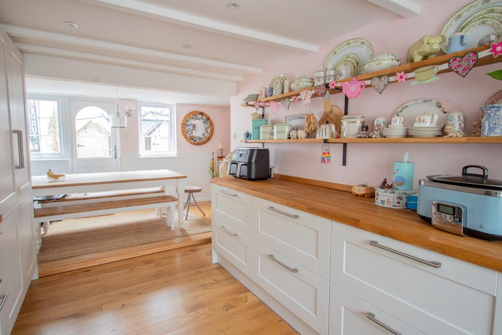 The charming accommodation comprises three bedrooms on the first floor, along with a modern, refitted shower room. On the ground floor, there is a welcoming lounge and a spacious kitchen/diner featuring modern fitted units, engineered oak flooring, and a range of integrated appliances including a range cooker, fridge/freezer, and dishwasher.