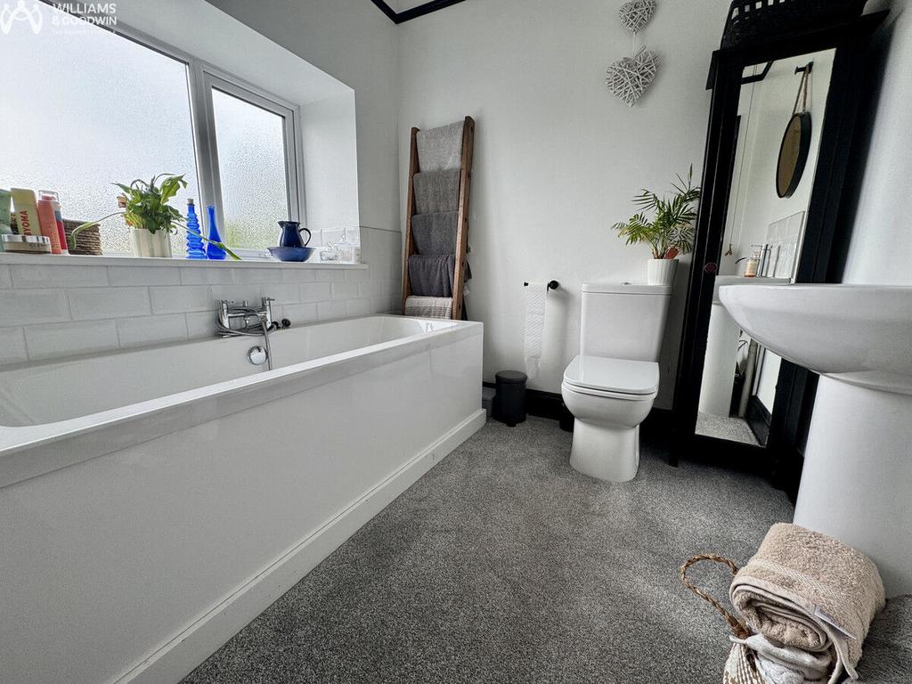 Fitted with a four piece suite comprising of a panelled bath with mixer tap and shower attachment, low level W.C., pedestal wash handbasin with tiled splashback together, radiator, frosted uPVC double glazed window to rear