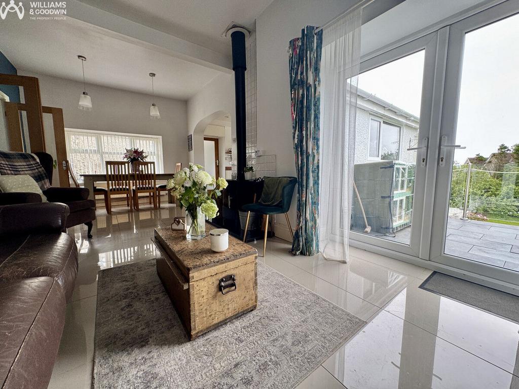 uPVC double glazed window to side with radiator under, uPVC double glazed French Doors opening up to rear balcony. Tiled flooring throughout, multi-fuel burner with granite hearth, opening to: