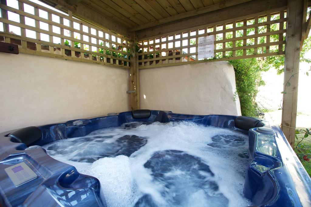 Outside, the gardens wrap around the front and rear of the property, with a gravelled courtyard, raised lawn, decked seating around the hot tub, and a drying area. To the rear, a private parking area offers space for up to six vehicles, accessed via Dovetons Close.