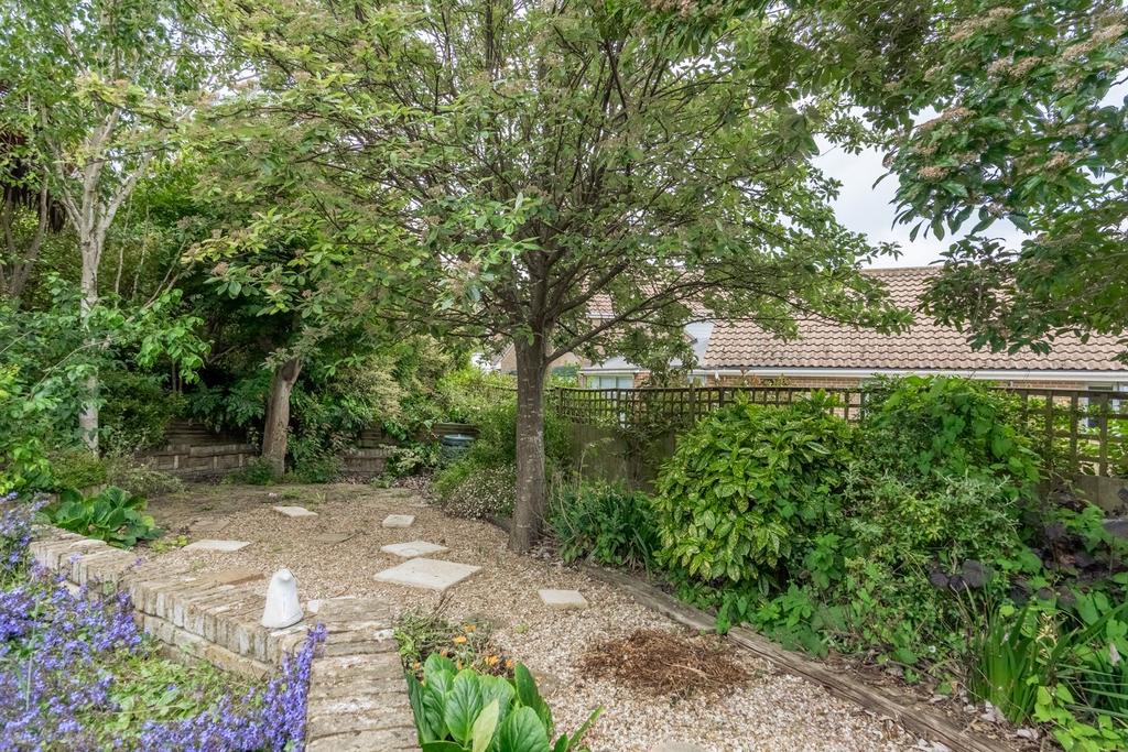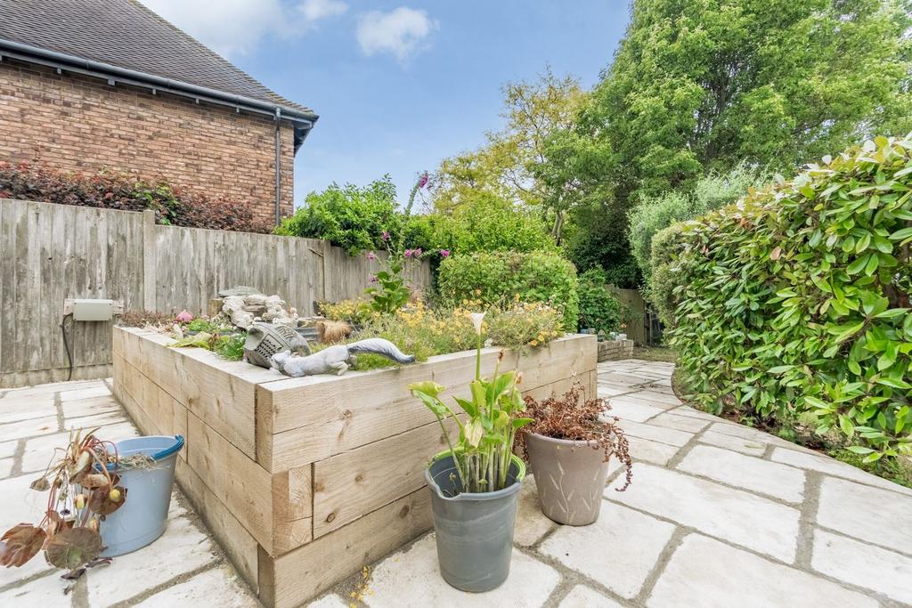 The garden is both substantial and private, with a sunny south-facing aspect, mature planting, and multiple spaces for dining, relaxing, and entertaining. A tranquil fish pond brings a sense of calm, while practical features such as side access and a garden shed offer excellent usability.