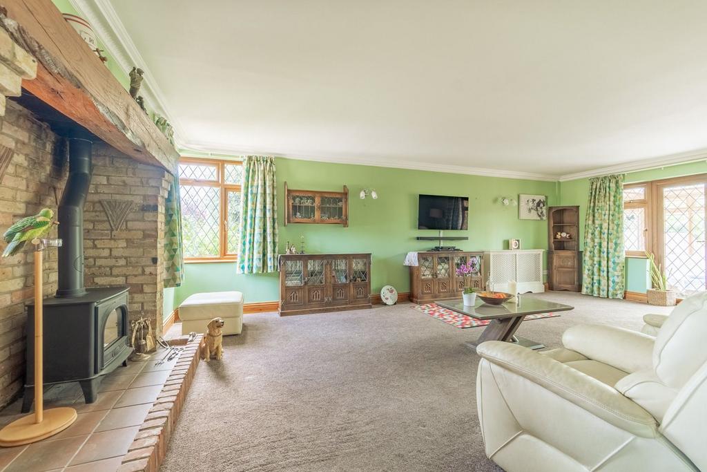 To the left of the hallway, the main reception room spans 25 feet by 15 feet, providing an elegant and comfortable space for relaxation or entertaining. It flows directly into the formal dining room (13' x 11'6") and on to the sunroom (15'2" x 9'), offering a beautifully connected living area that takes full advantage of the garden aspect and natural light.
