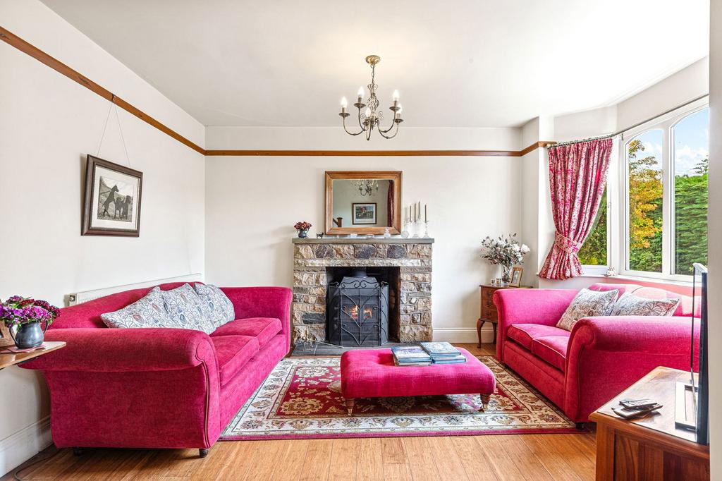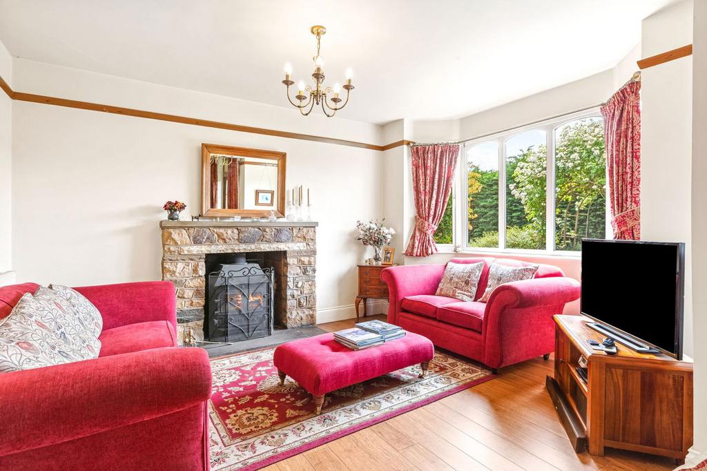 Step through the entrance porch into a welcoming open-plan hallway, which flows into the living room with a feature bay window and cosy log burner. The spacious breakfast kitchen is well-equipped with stylish wall and base units, marble worktops, an island unit, and an oil-fired Rayburn that provides central heating, hot water, and cooking facilities. The kitchen also features "Neff" electric oven and hob.