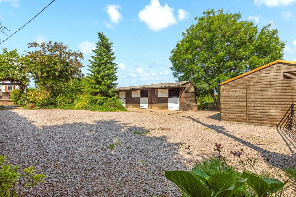 A wide gateway entrance off Ostler Lane leads to a substantial off-road parking area, perfect for multiple vehicles and equestrian transport. The grounds include a large timber barn with an integrated store, a detached stable block with four loose boxes, and securely fenced paddocks — ideal for horses or livestock.