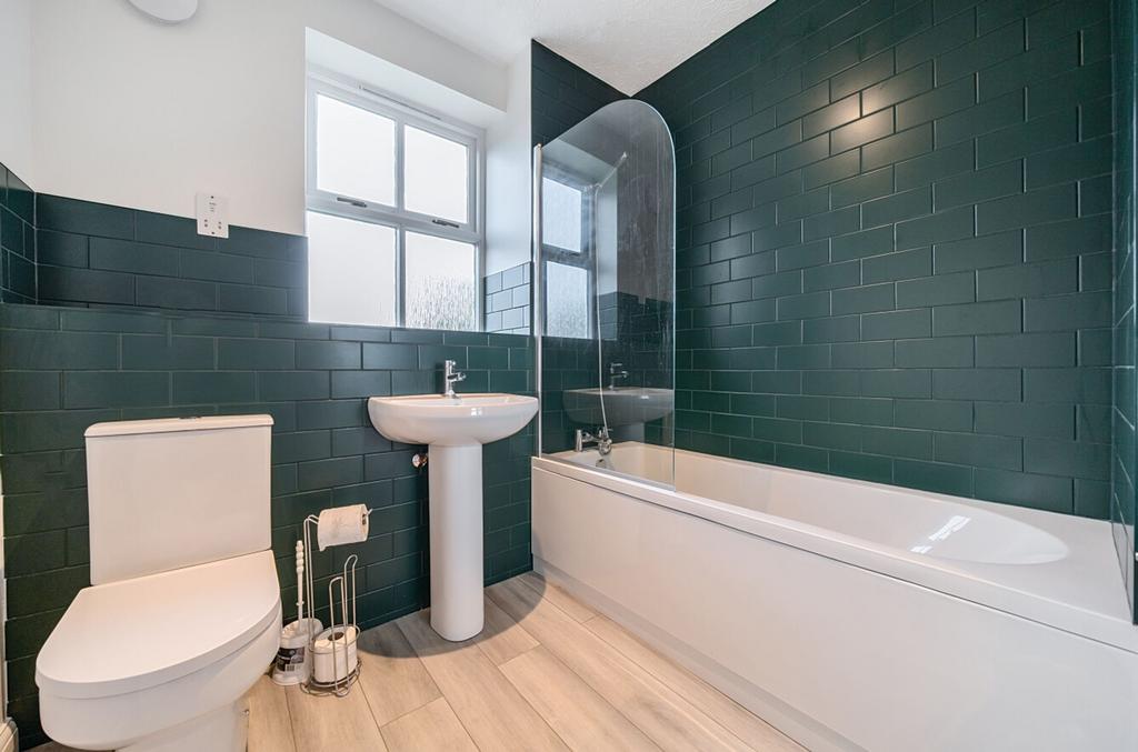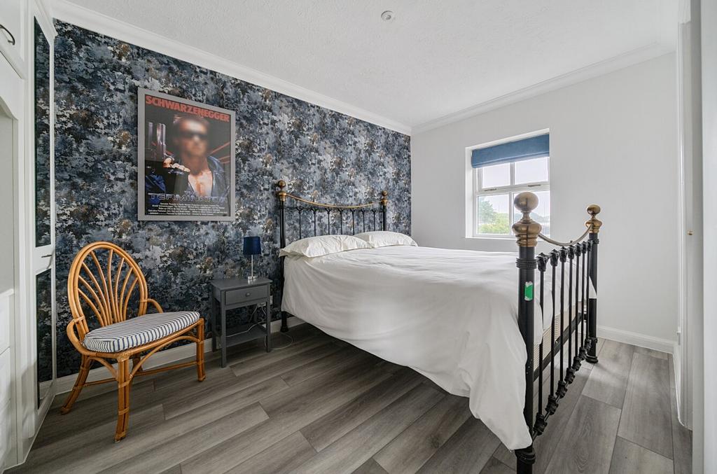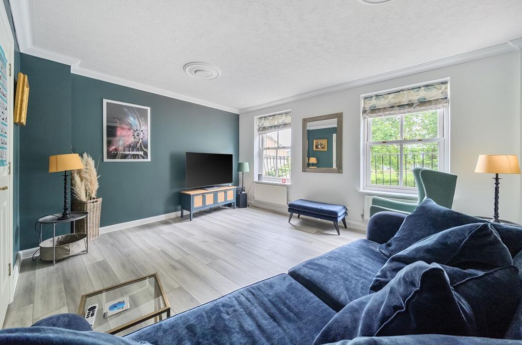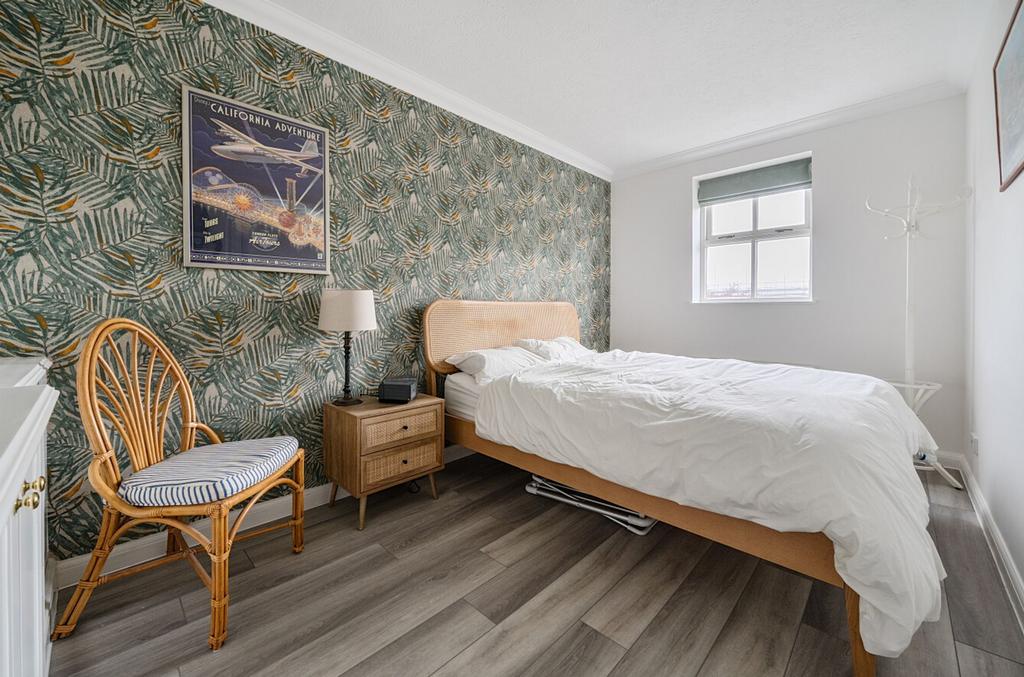 The property’s bespoke staircase, with stainless steel handrails and glass balustrades, adds a striking architectural feature while connecting the living spaces. On the first floor, a generously proportioned sitting room, measuring over 15 feet in length, offers elevated views across the tranquil King George Gardens Park. Also located on this floor is the third bedroom, which enjoys a peaceful south-facing outlook over the garden. This room is ideal as a guest bedroom, home office or study, served conveniently by a stylishly appointed family bathroom located nearby.
