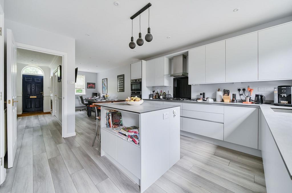 Upon entering, you are welcomed into a bright and airy entrance hall that leads seamlessly into the heart of the home, a spacious open-plan kitchen, dining and family room. The south-facing orientation floods the space with natural light throughout the day, creating a warm and inviting atmosphere. The contemporary kitchen has been meticulously designed, featuring sleek cabinetry, integrated appliances, a generous breakfast island with seating and ample storage. This versatile space effortlessly accommodates both family life and entertaining, with a door opening directly onto the landscaped garden, extending the living area outdoors during the warmer months.