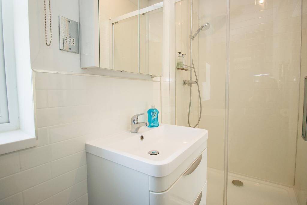 Shower unit with rainfall shower head. Handbasin in vanity unit and wc. Upvc double glazed window.