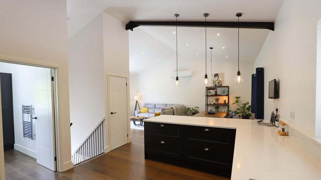 Vaulted space, engineered wood floor, electric under-floor heating, kitchen fitted with a range of matching base units and wall cabinets, integrated fridge, integrated freezer, integrated Bosch electric fan oven, integrated Bosch microwave fan oven, integrated Neff induction hob with extractor over, integrated Bosch wine cooler, built-in bin unit, white quartz worktop, double stainless steel sink unit with Quooker tap, integrated dishwasher, soft closing drawers, breakfast bar end with pendant lights over, large cupboard housing pressurised hot water system, extractor fan, spotlights.