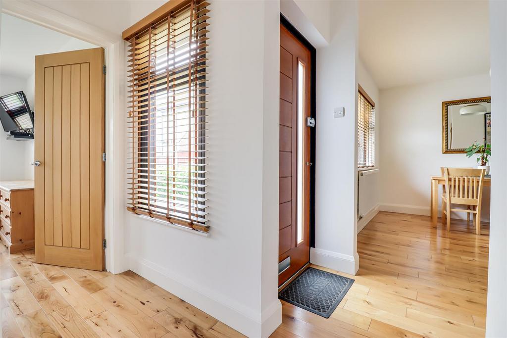 'L' Shaped Hallway - Smooth ceiling with a pendant light, storage cupboard, solid wood entrance door to the front, double glazed windows to the side, real wood flooring, door to: