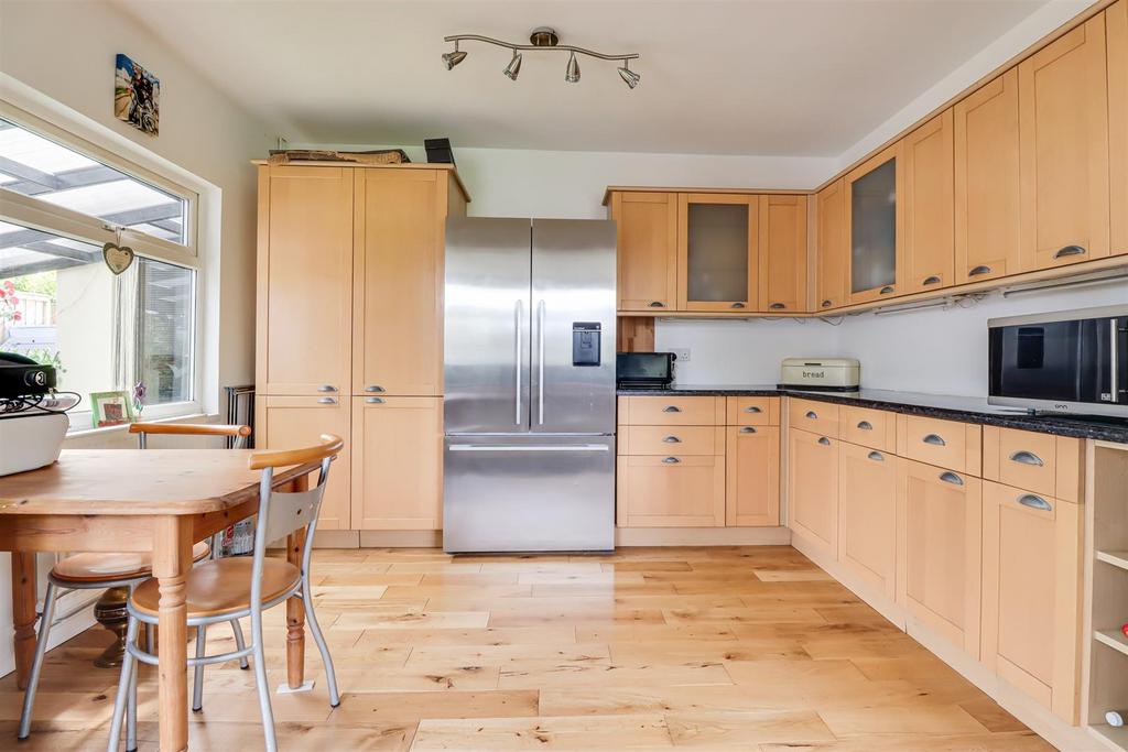 Kitchen Breakfast Room - 5.77m > 3.66m x 4.72m > 2.13m (18'11" > 12'0" x 1 - Smooth ceiling, double glazed windows to the rear overlooking the garden, double glazed window to the side, double glazed French doors to the side leading out to the garden, modern shaker style kitchen comprising wall and base level units with a roll edge laminate worktop, floor to ceiling cupboards, space for an American style fridge freezer, space for a range cooker with an extractor fan above, two seater breakfast bar, 1.5 inset sink with draining grooves, tiled splashback, space for a washing machine, heated towel rail, oak flooring with a vinyl flooring, radiator, cupboard housing a wall mounted boiler, space for a tumble dryer.