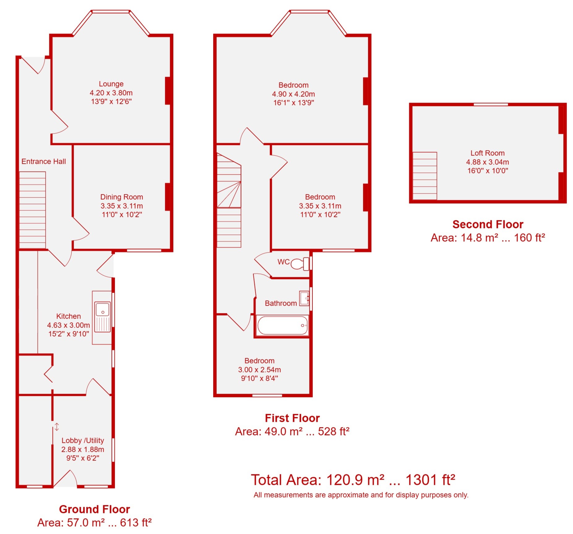 First Floor: Landing * steps to loft room with potential as fourth bedroom (stnc) * Three Bedrooms * Bathroom * Separate W.C.