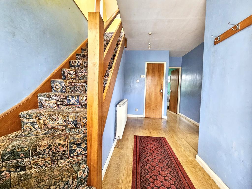 ENTRANCE HALL with wood laminate flooring, radiator, power point, airing cupboard with hot water cylinder and shelving. understairs cupboard.