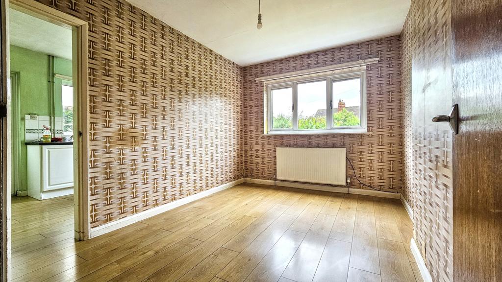 DINING ROOM (3.5m x 27m approx )(11'4" x 8'8"approx) with wood laminate flooring, side window overlooking gardens, radiator, TV point, power point and door to;