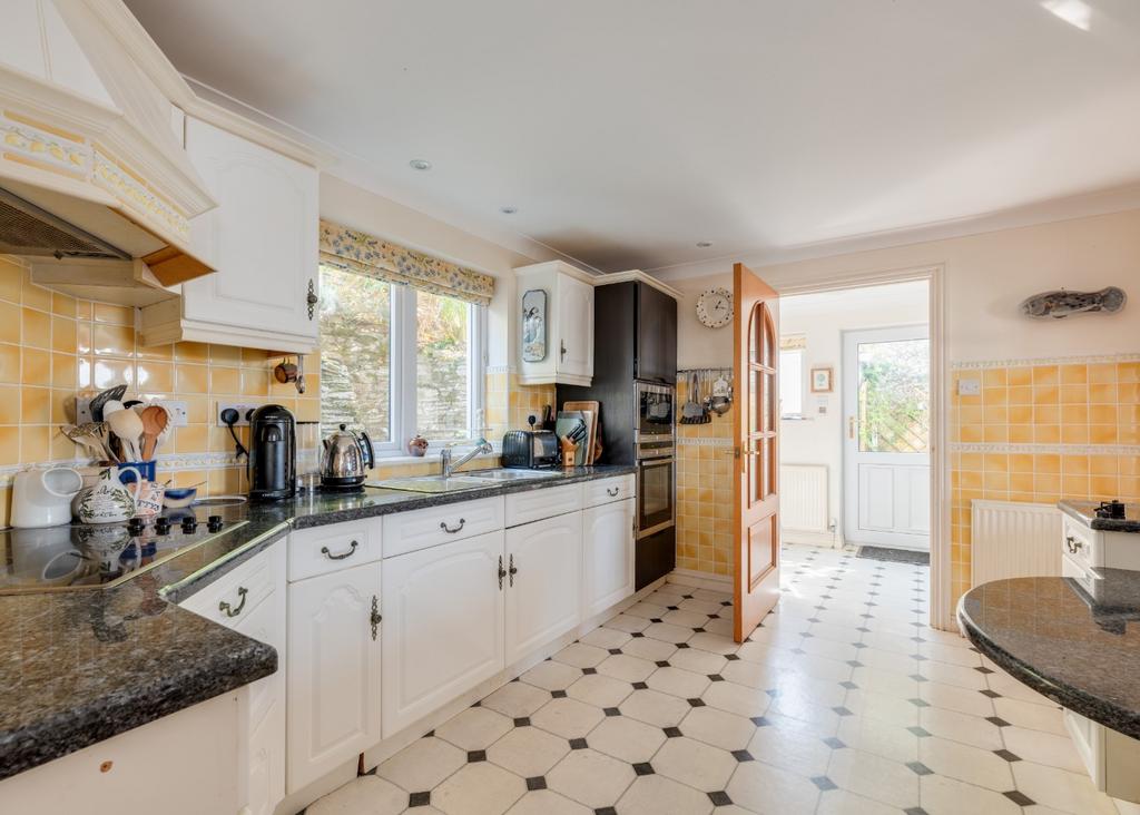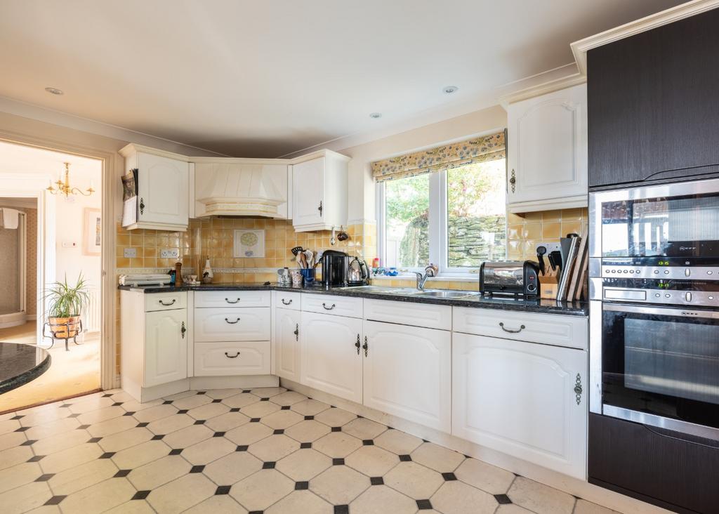 On the opposite side of the hallway, the dual-aspect dining room provides a sociable and welcoming space, also with glazed patio doors to the front alfresco dining terrace and direct access to the kitchen. The kitchen features a range of fitted units topped with striking Blue Pearl granite work surfaces and leads to a utility room housing a washing machine, tumble dryer, tall larder cupboard, and a side door for external access.