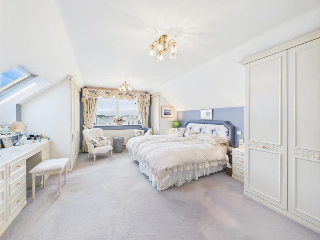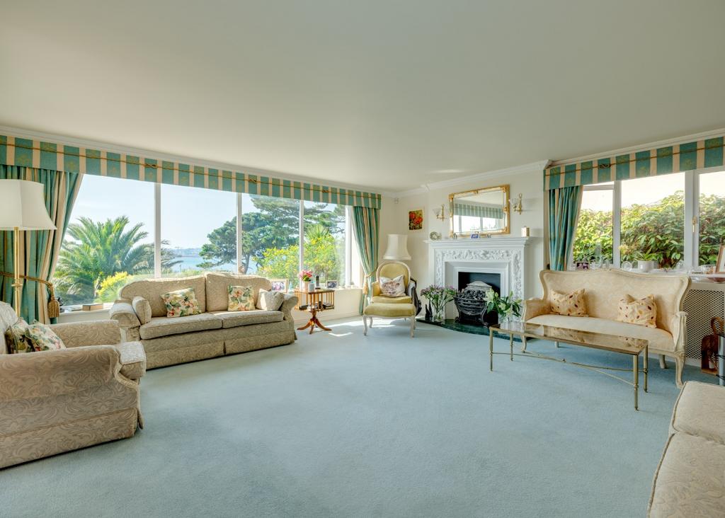 Stone steps framed by mature shrubs lead to the glazed front entrance of Curlews, opening into a generous hallway that sets the tone for this elegant and spacious home. To the left, a stunning triple-aspect sitting room captures breathtaking views across the water to Falmouth and the surrounding countryside. A luxurious Harrods electric fire is set within an impressive marble mantel, creating a cosy focal point during the winter months. In warmer weather, sliding doors open onto the front terrace, seamlessly blending indoor and outdoor living.