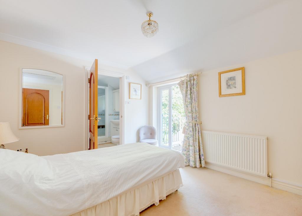 A turning staircase leads to a gallery landing on the first floor, featuring a large picture window that perfectly frames the expansive views. Three well-appointed double bedrooms are found on this level, each with its own en suite bathroom. The principal bedroom is particularly generous, with a front-facing window, a large en suite complete with a jacuzzi bath and separate shower, and ample storage. Bedroom two enjoys a Juliet balcony to the rear and a dormer window to the front, capturing both privacy and panorama. The third bedroom, located to the rear, opens onto a walkway that leads directly to the upper garden terrace. A large, shelved airing cupboard housing the water tank and eaves storage completes the upstairs accommodation.
