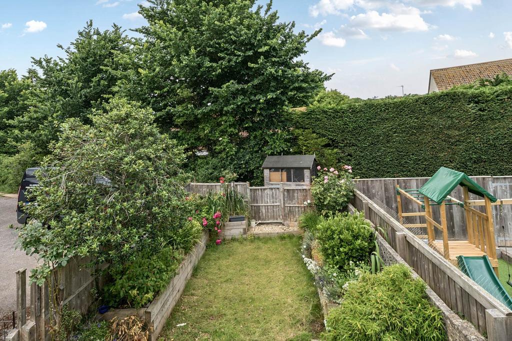 The rear garden comprises an area on concrete that adjoins the property and provides access to a wooden shed and lean -to potting shed. Steps lead up to a small paved area with lawn and raised timber flower and shrub beds containing a mix of plants including roses, raspberry bushes and other spring and summers flowers. A gate leads to the communal parking area, and a further area of small garden that includes a shed. Shared path to neighbouring property.