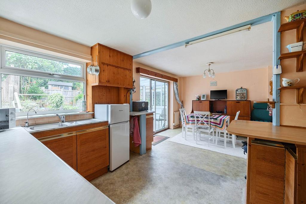 Window to rear overlooking the garden. The kitchen is fitted with a range of wall and base units with laminate work surfaces and inset stainless steel sink unit and drainer. Space for a free standing cooker. Small island unit. Shallow understairs cupboard. Part glazed screen and door to living room. Two radiators. Door to