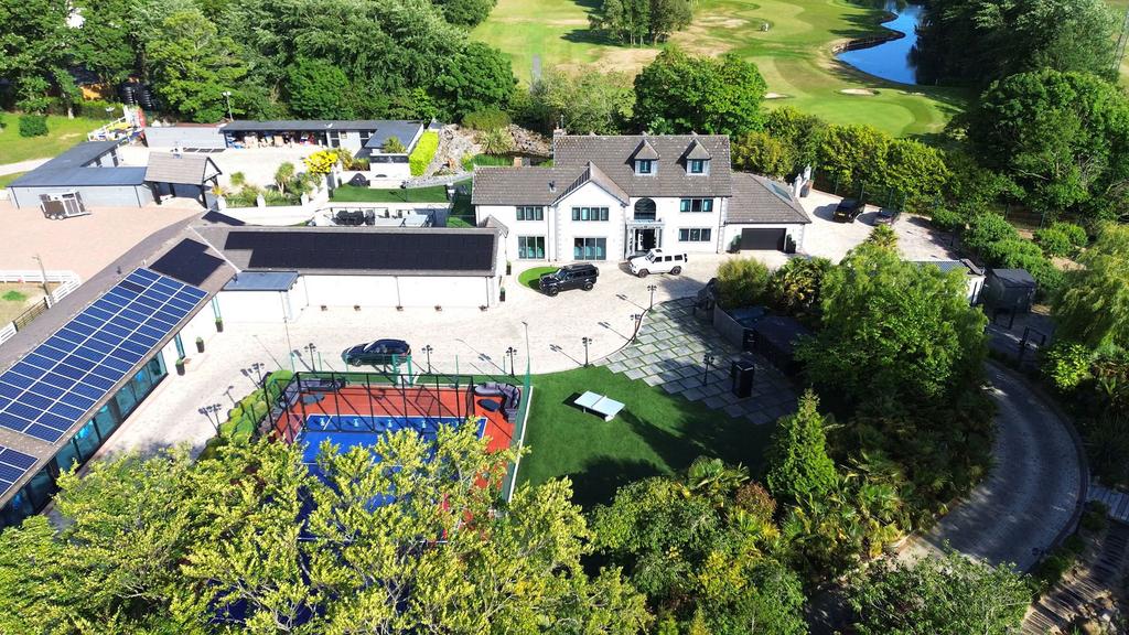 The property offers a large double garage and secure gated off-road parking for up to 100 vehicles—ideal for guests, staff, and security personnel. An on-site equestrian centre with stabling and paddocks is also available by separate negotiation.
