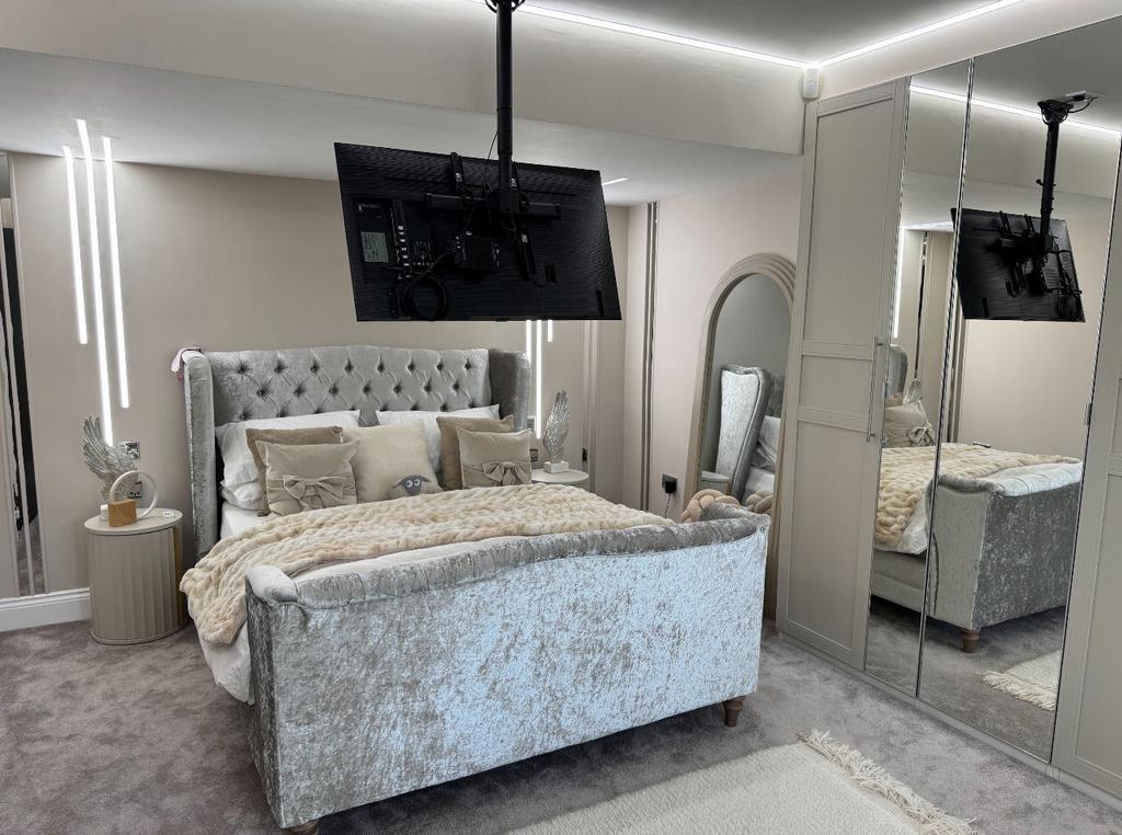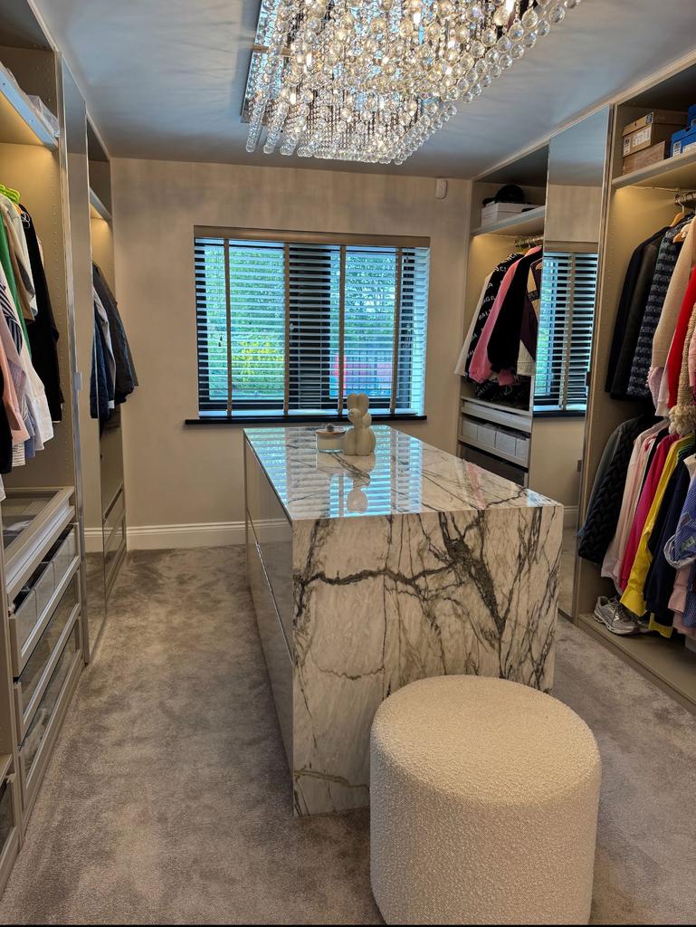 This grand residence combines sophisticated design with homely comfort. Accommodation comprises five oversized bedrooms, each with private en-suite bathrooms featuring high-quality fittings, walk-in showers, and luxury bathtubs. The principal suite offers a dressing area, spa-style bathroom, and views across the estate grounds.