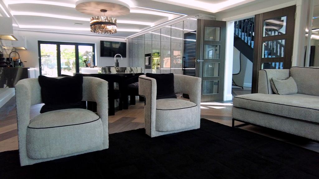 The three principal reception rooms have been thoughtfully designed for both entertaining and relaxation, including a formal drawing room with statement fireplace, a stylish lounge with bi-fold doors leading to the garden, and a media snug ideal for more informal gatherings.
