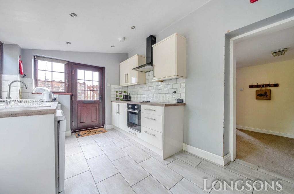 Range of fitted units to walls and floor, work surface over, one and a half bowl sink unit with mixer tap and drainer, integrated electric oven, induction hob with extractor hood over, space and plumbing for dishwasher and washing machine, space for fridge/freezer, tiled splashback, ceiling spotlights, tiles to floor, UPVC double glazed windows to rear and side, UPVC French doors opening to rear garden, entrance door to side