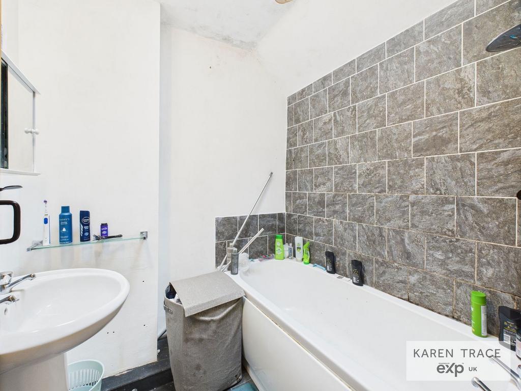 Part-tiled with a white two-piece suite comprising bath with electric shower over, and pedestal wash hand basin. Velux roof window, vinyl flooring, and wood panel door.