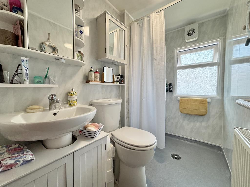 Wet room suite comprising shower, low flush WC, pedestal hand wash basin with underneath storage, UPVC double glazed opaque window to the side aspect, radiator.
