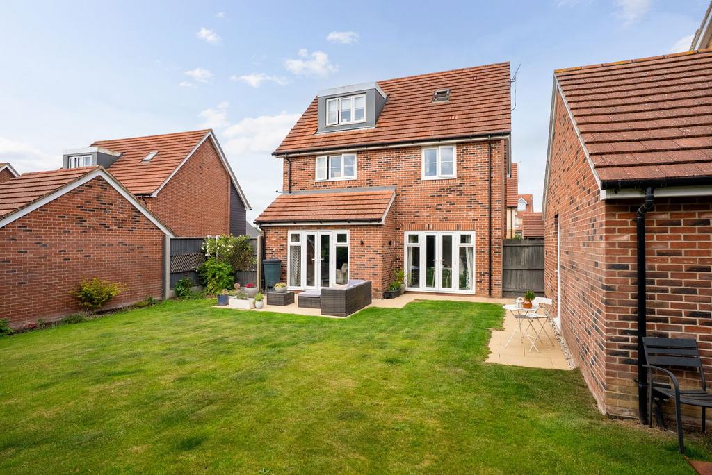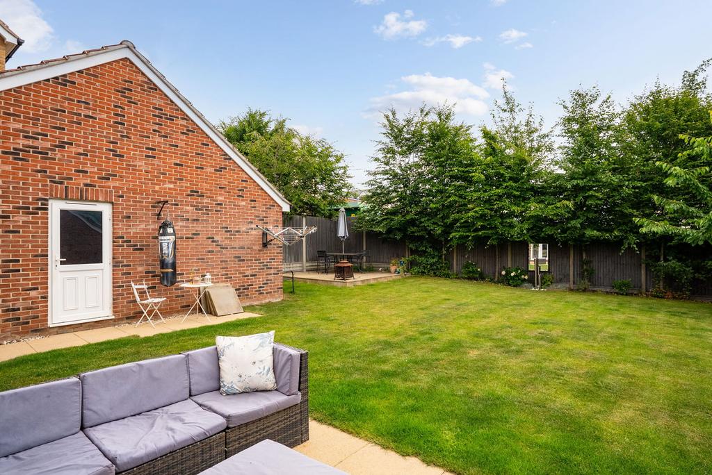 The rear garden is fully enclosed and enjoys a good degree of privacy. Mainly laid to lawn, it features a variety of thoughtfully arranged seating areas, including a paved terrace ideal for outdoor dining and summer entertaining. Well-stocked borders and mature planting enhance the sense of seclusion, creating a peaceful and inviting setting for both family life and social gatherings.