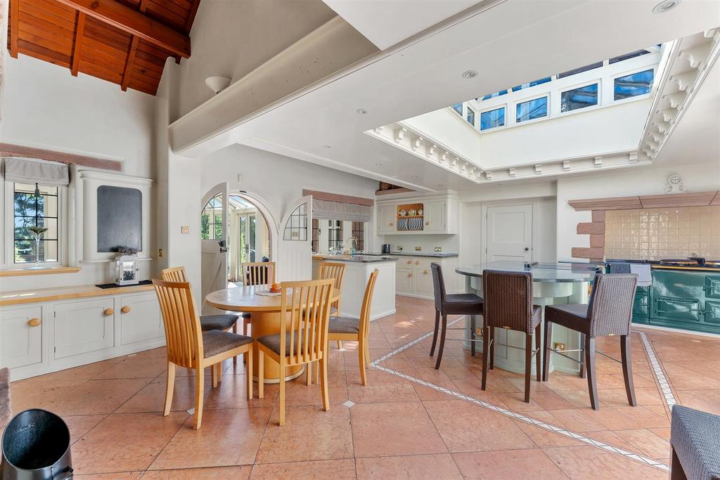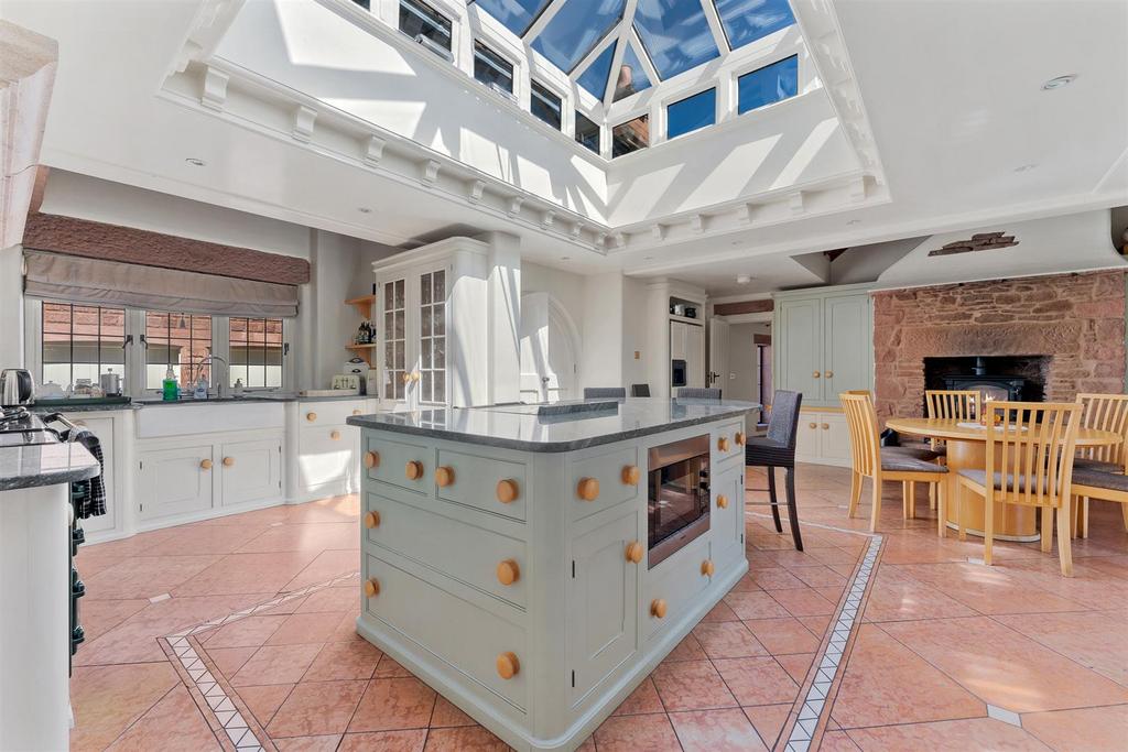 Features of particular note include the impressive entrance hall with pitch pine wall panelling, the open plan living kitchen with Mark Wilkinson Kitchen with AGA and integrated appliances, and the five reception rooms with open fireplaces and exuding charm and character throughout. Designed with practicality in mind there is a spacious boot room, secondary kitchen and laundry.