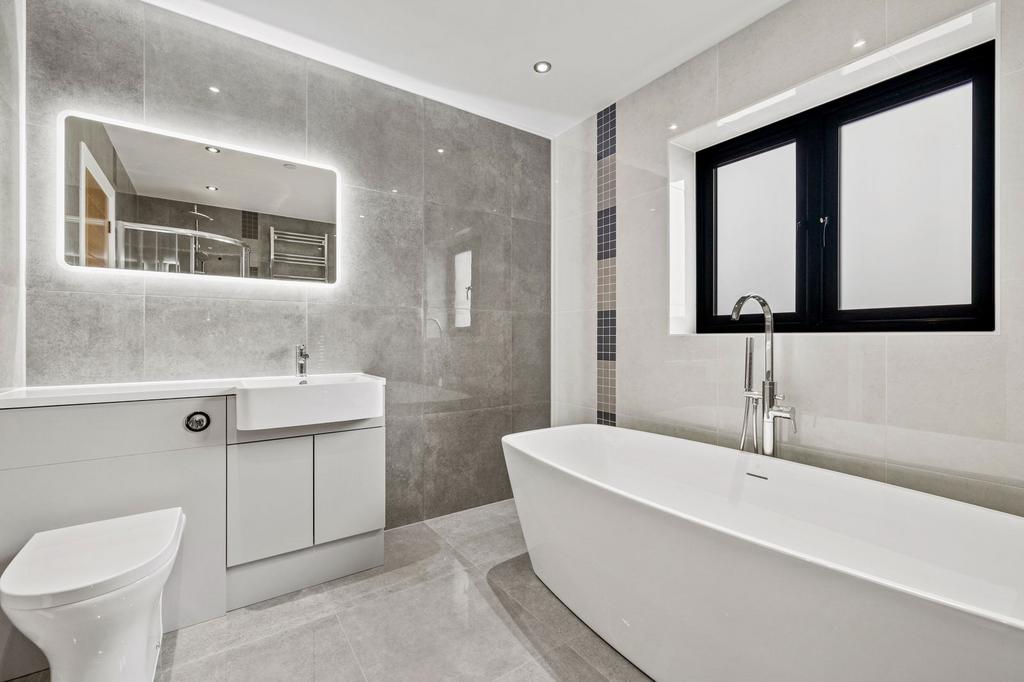 Modern bathroom is fitted with grey gloss tiles, a freestanding double-ended bath with floor-mounted chrome tap and shower attachment, and a curved glass shower enclosure with rainfall and handheld options. It includes a wall-hung vanity with built-in storage, a square basin, chrome mixer tap, and concealed cistern WC. A backlit LED mirror and chrome heated towel rail. uPVC triple-glazed window to rear.