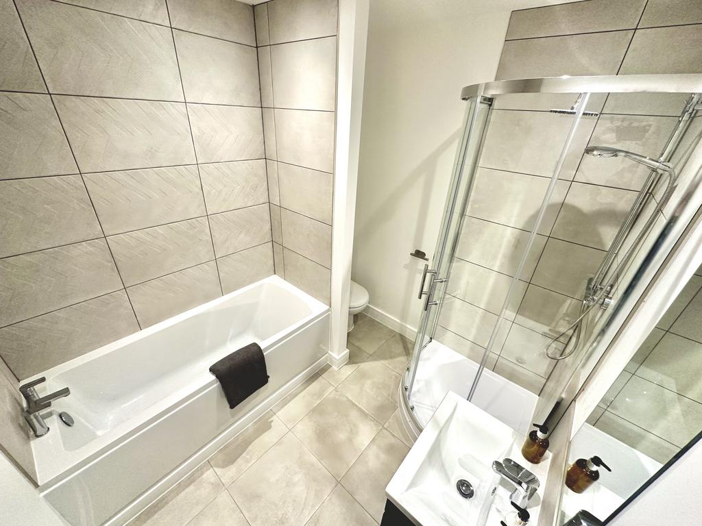 The master bedroom is generously sized with a large partition to the living space. and offers a comfortable and inviting retreat. The bathroom is fully fitted with modern amenities, including large shower and separate bath making it the perfect place to relax and unwind.