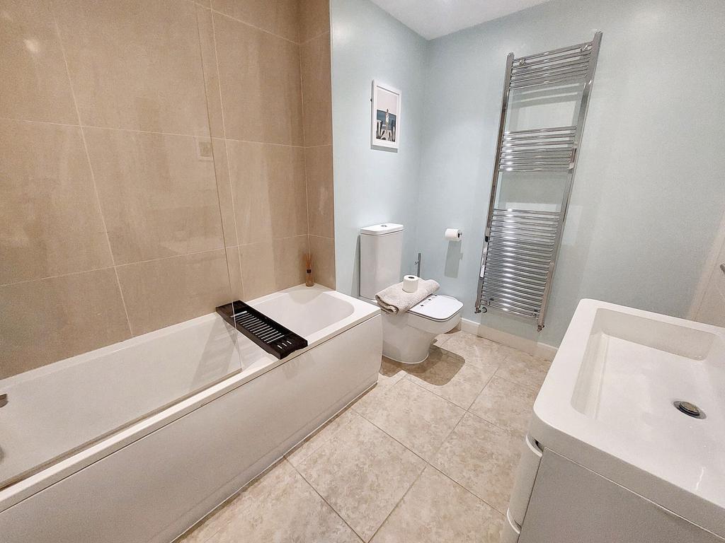 A clean, modern bathroom with a soothing, spa-like atmosphere. A white bathtub with a tiled shower wall and a glass screen sits along the far side, equipped with a contemporary chrome showerhead and tap fitting. On the tub rests a black bath caddy for added convenience. The white ceramic toilet is positioned to the right, topped with neatly folded beige towels and a roll of toilet paper, enhancing the room’s ready-for-guests appeal. On the left, a sleek rectangular sink with a chrome mixer tap is integrated into a white vanity unit, offering both functionality and minimalist style.