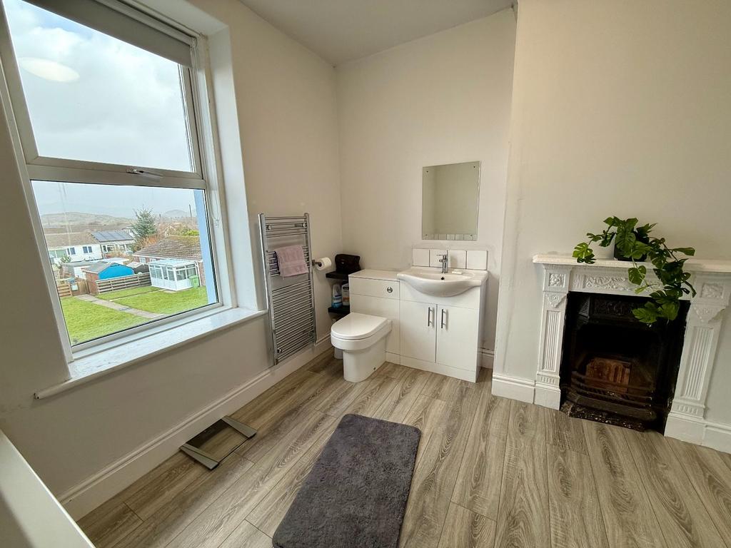 Window to rear with far distant views towards Barmouth, Barmouth Bridge and mountain range beyond, newly fitted bathroom suite comprising large quadrant shower cubicle with mains shower and wet wall panelling, panelled bath with tiled wall, vanity wash hand basin and W.C, heated towel rail/radiator, cast iron feature fireplace, extractor fan, laminate floor.