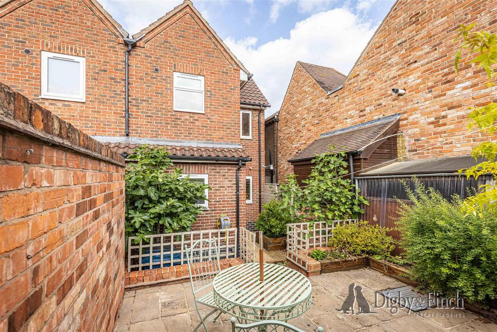 Gardens - Externally, the property benefits from a single garage with an electric up-and-over door, offering excellent storage or secure parking. A designated parking space is located directly in front of the garage. A pathway leads down the side of the property to a gated entrance into the charming courtyard garden.