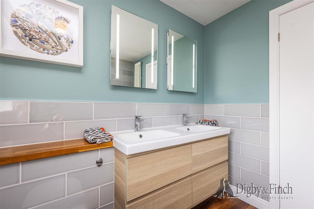 The family bathroom, also located at the rear, is finished to a high standard. It features a wood floor and a traditional roll-top bath with glass screen and shower over, set against characterful oversized subway tiling. A large vanity unit houses two wash hand basins, each with its own illuminated mirror above, and there is a WC completing the suite.
