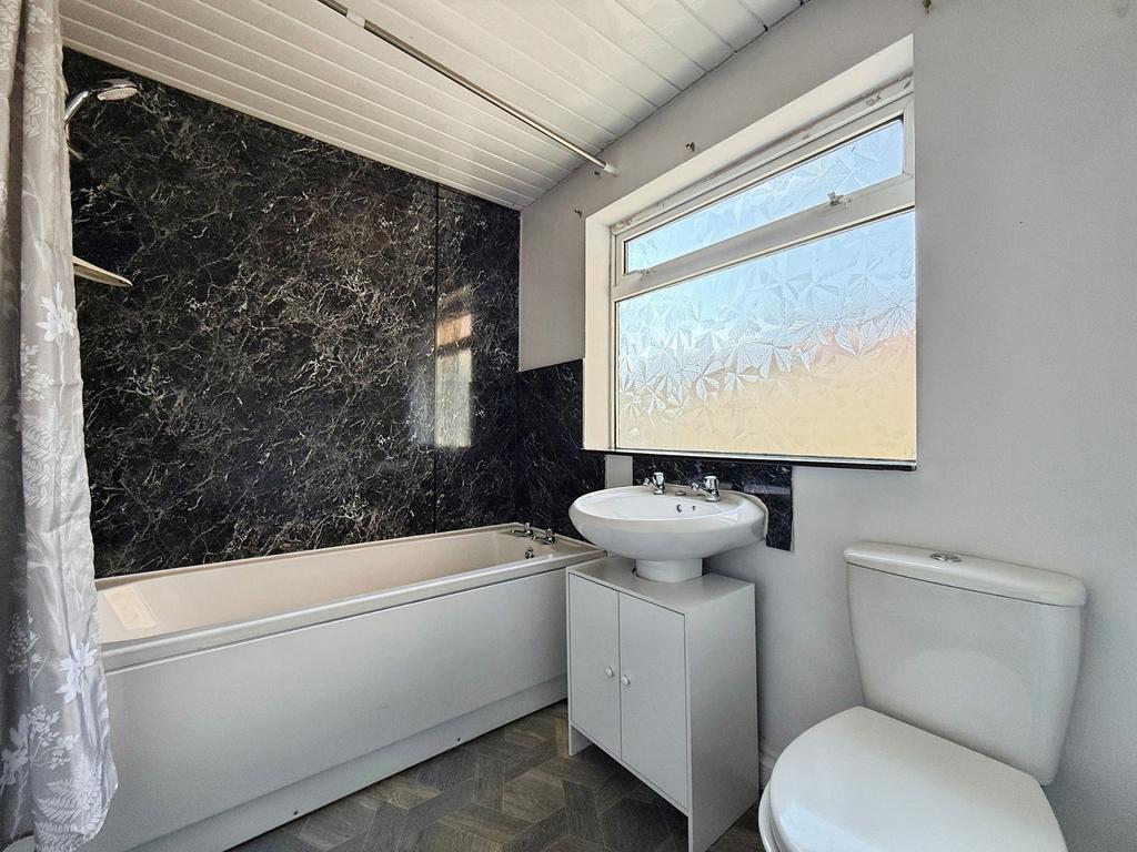 The bathroom is of a modern design, featuring a bath with a shower over, WC, and a wash hand basin. Finished with aqua-panelled walls and vinyl flooring, it is both stylish and practical.
