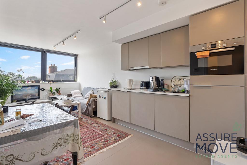 The flat boasts a sleek open-plan living area with large double-glazed windows allowing for an abundance of natural light, a contemporary fitted kitchen with integrated appliances, and a spacious lounge area perfect for relaxing or entertaining. The double bedroom offers a comfortable and quiet space, while the modern bathroom is finished to a high standard with stylish grey tiling and a full-size bath/shower.
