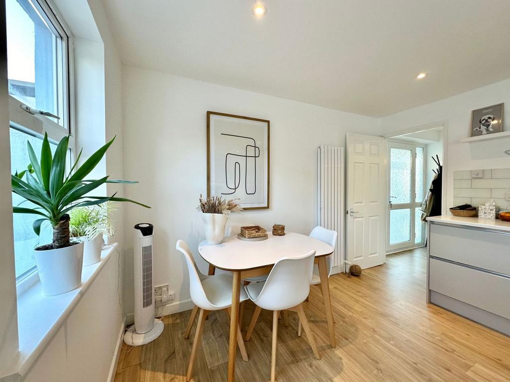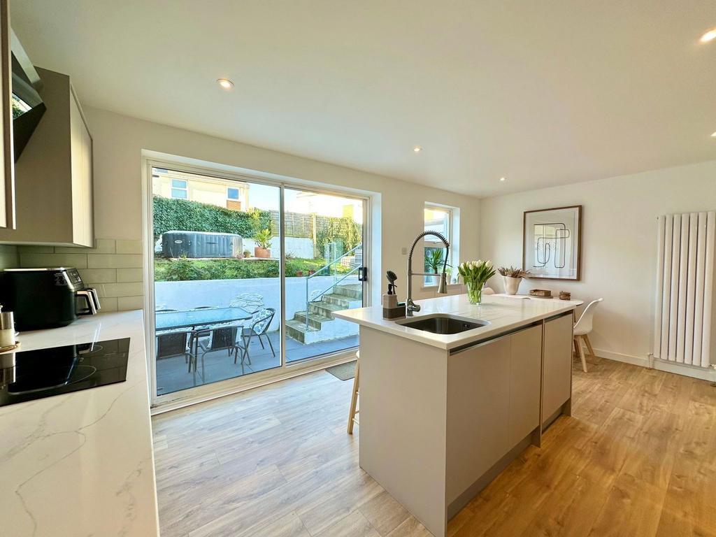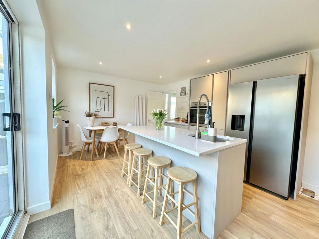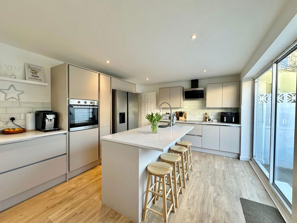 Inset spotlights, UPVC double glazed window to rear aspect, vertical radiator with thermostat control. Contemporary fitted kitchen with a range of base and drawer units and quartz work surfaces over, four ring electric hob with extractor over, tiled surrounds, matching wall cabinets, central island with inset sink and drainer with mixer tap over, storage cupboards and breakfast bar, built-in eyelevel electric oven, space for American style fridge/freezer, integrated washing machine, integrated dishwasher, pantry cupboard with light point and shelving, double glazed sliding doors leading to the rear garden.