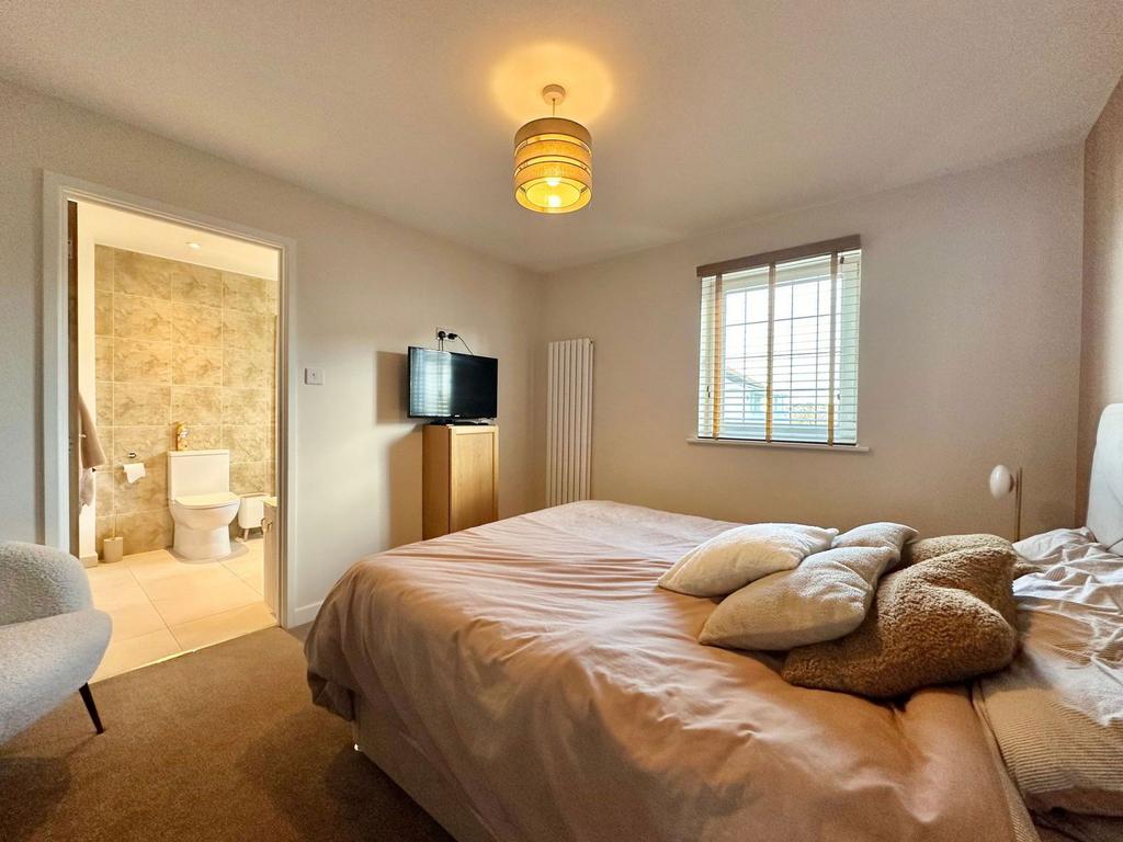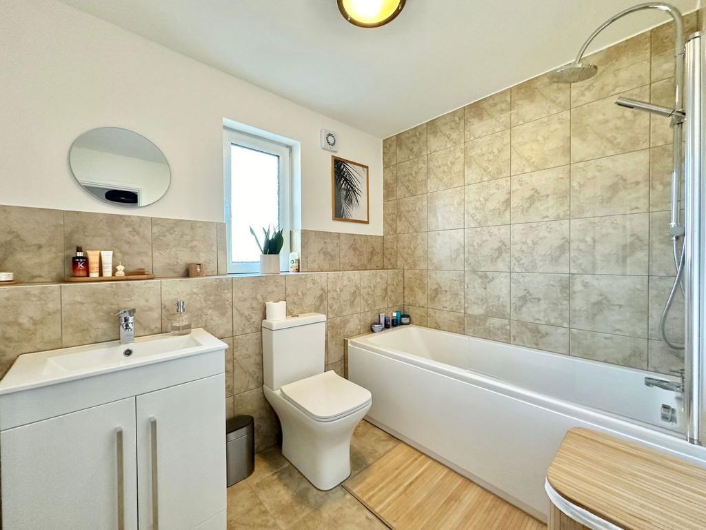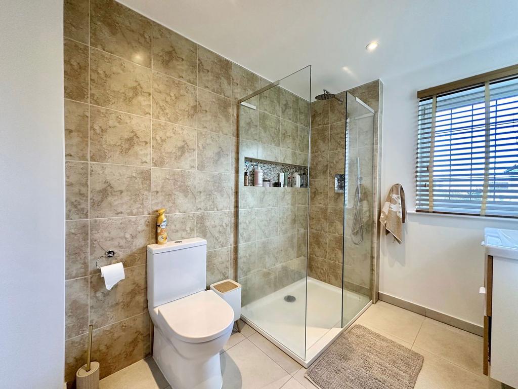 Inset spotlights, UPVC double glazed window to front aspect, heated towel rail. Comprising walk-in shower enclosure with glazed screens, vanity unit with inset wash hand basin and tiled splashback, close coupled W.C, tiled walls, tiled floor.