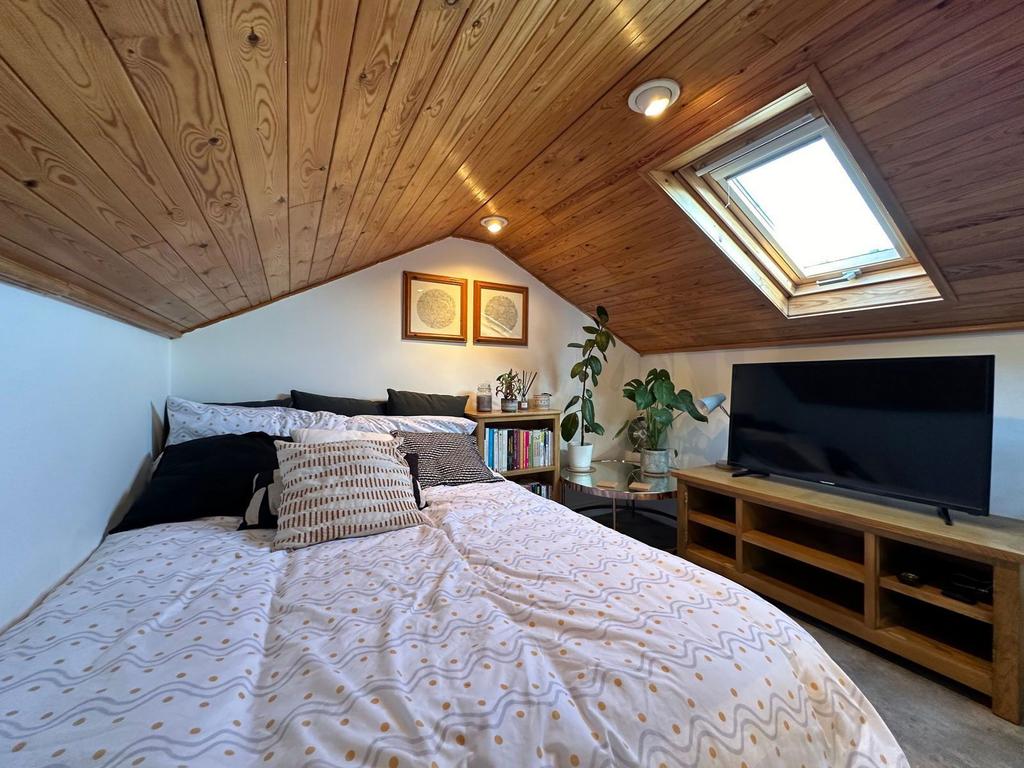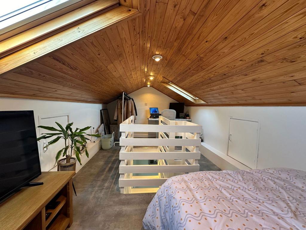 With sloping ceilings and inset spotlights, two velux windows, access to under eaves storage, power sockets.