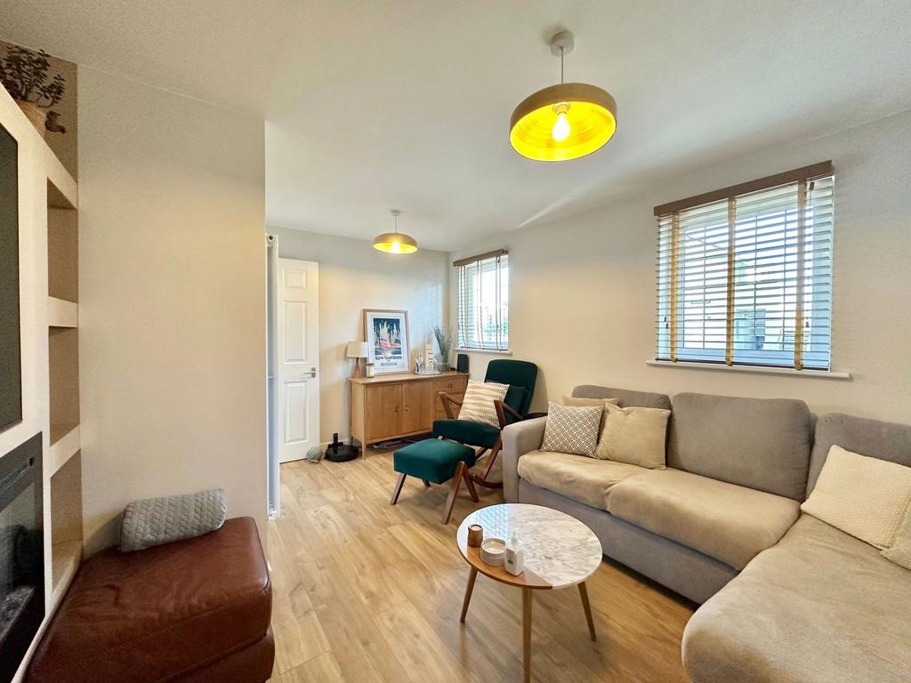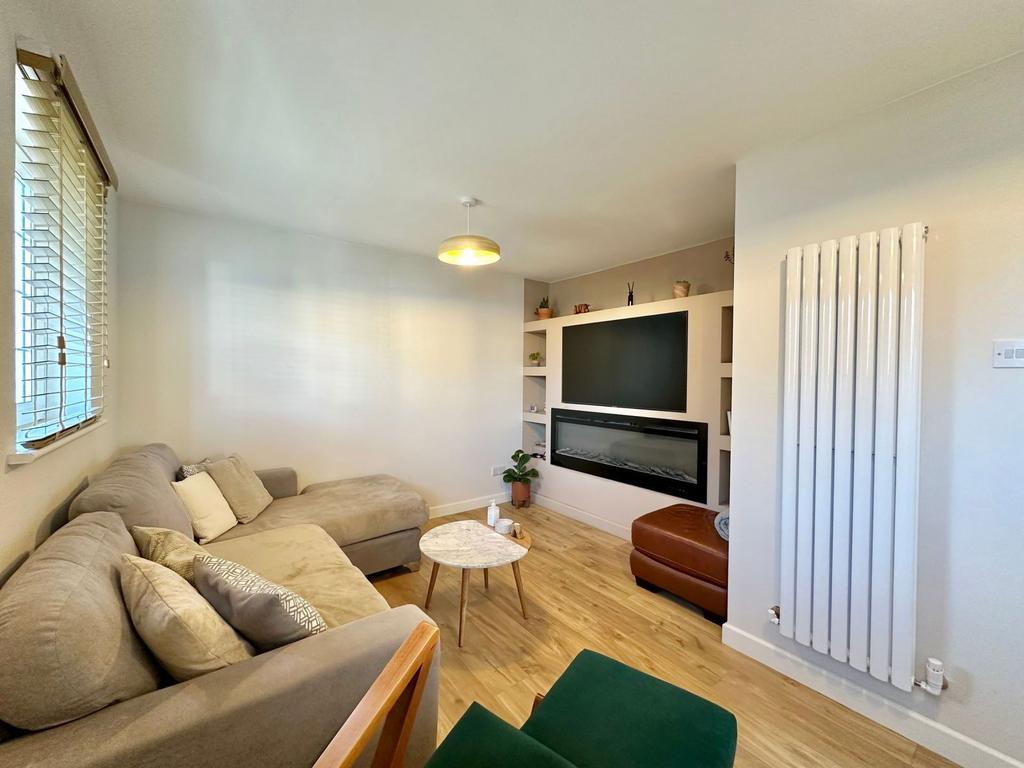 Pendant light points, UPVC double glazed windows to front aspect, vertical radiator with thermostat control, recess with built-in media unit with space for TV and storage shelving to side, inset electric fire.