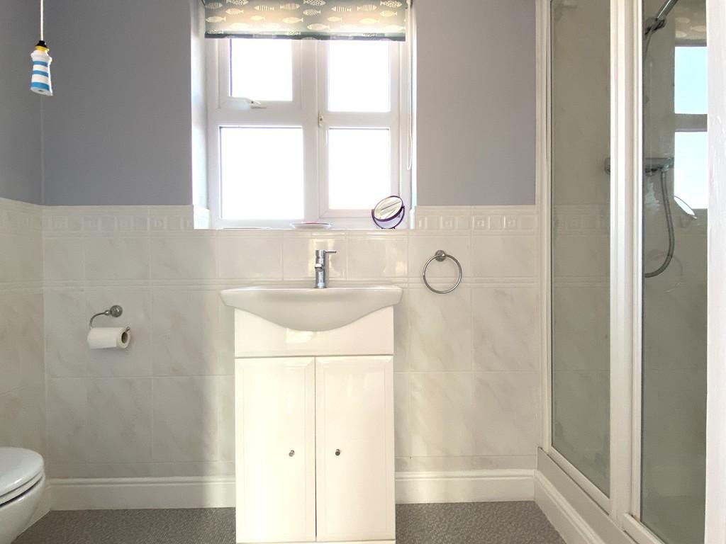 En-Suite Shower Room 9' 8" x 3' 10" (2.95m x 1.17m) Fitted with a white vanity basin with mixer tap and unit beneath, low level WC, shower enclosure with bi-fold door, tiled walls and mixer shower, uPVC double-glazed window with obscure glass to side aspect, radiator, recessed LED spotlights and extractor fan.