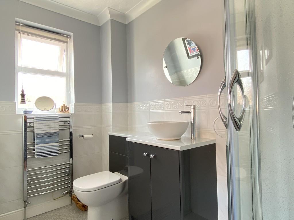 En-Suite Shower Room 8' 9" x 4' 10" (2.67m x 1.47m) Fitted with contemporary sanitaryware comprising curved corner shower cubicle with mixer shower and showerwall, low level WC with concealed cistern, countertop basin with pillar tap and unit beneath, heated towel rail, part-tiled walls, recessed LED spotlights, extractor fan, uPVC double-glazed window with obscure glass to rear aspect.