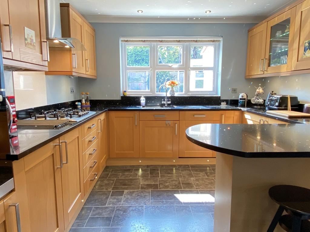 Kitchen/Breakfast Room 13' 1" x 10' 5" (3.99m x 3.18m) Nicely fitted with a range of wood fronted shaker style base units with quartz working surfaces over, eye level Bosch double oven, five ring gas hob with canopy extractor over, breakfast bar, one and a half bowl sink with mixer tap, integrated dishwasher, space for a fridge freezer, gas boiler providing central heating and domestic hot water, concealed within a unit, breakfast bar, uPVC double-glazed window to side aspect, recessed LED spotlights, radiator, glazed door to reception hall.