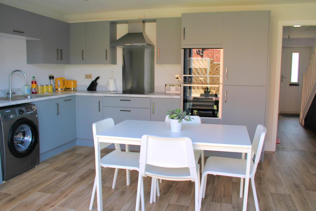 The social heart of the home linking to the enclosed rear gardens and extensively appointed with a contemporary range of grey fronted units with light grey marbled work surfaces and including an inset single stainless steel sink with 2 units under, space and plumbing for an automatic washing machine, a further 4 base units, an integrated electric hob with steel splash back and chimney extractor over, built in oven and microwave with storage over and under, built in refrigerator and freezer, an additional 6 units at eye level together with 1 housing the gas fired combination boiler, spot lighting, radiator and Pvcu double glazed french doors and side screens.