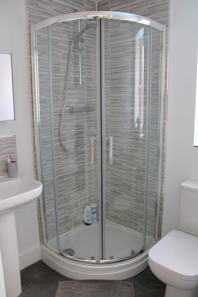 Stylishly appointed with a suite in white with contrasting grey coloured slate effect ceramic tiling to the splash and shower areas and including a close coupled wc, pedestal wash hand basin, quadrant shower enclosure, radiator, spot lights, extractor and Pvcu double glazed window.