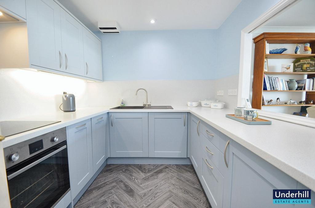 The modern kitchen is both functional and stylish, offering a generous layout with white square-edged worktops, powder blue units and grey wood effect flooring, creating a contemporary feel. Features include an electric fan oven, an electric hob and integrated extractor, a washer/dryer and a slimline dishwasher. The kitchen is also equipped with an integrated multi-bin and space for an upright fridge-freezer. A practical serving hatch to the living room enables people to socialise and enjoy the view whilst working in the kitchen.